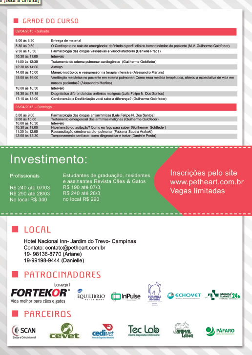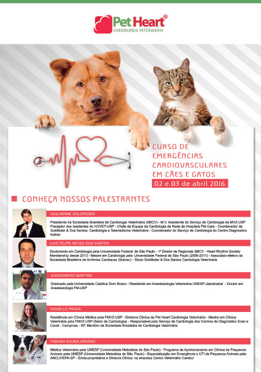 O Curso de “Curso de Emergências Cardiovasculares em Cães e Gatos“, ministrada no dia 02 e 03 de Abril de 2016, está disponível àqueles que participaram do evento. Basta solicitar o material usando o formulário abaixo e você o receberá diretamente em seu e-mail.